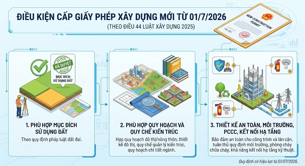 Theo quy định tại Điều 44 Luật Xây dựng 2025, điều kiện cấp giấy phép xây dựng mới từ ngày 01/07/2026 được quy định như sau: