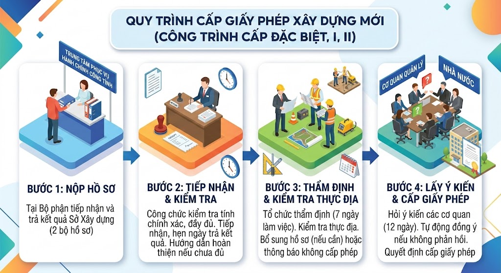 Thủ tục cấp Giấy phép xây dựng mới đối với công trình cấp đặc biệt, cấp I, cấp II (Công trình không theo tuyến/ Theo tuyến trong đô thị/ Tín ngưỡng, tôn giáo/ Tượng đài, tranh hoành tráng/Theo giai đoạn cho công trình không theo tuyến/ Theo giai đoạn cho công trình theo tuyến trong đô thị/ Dự án)