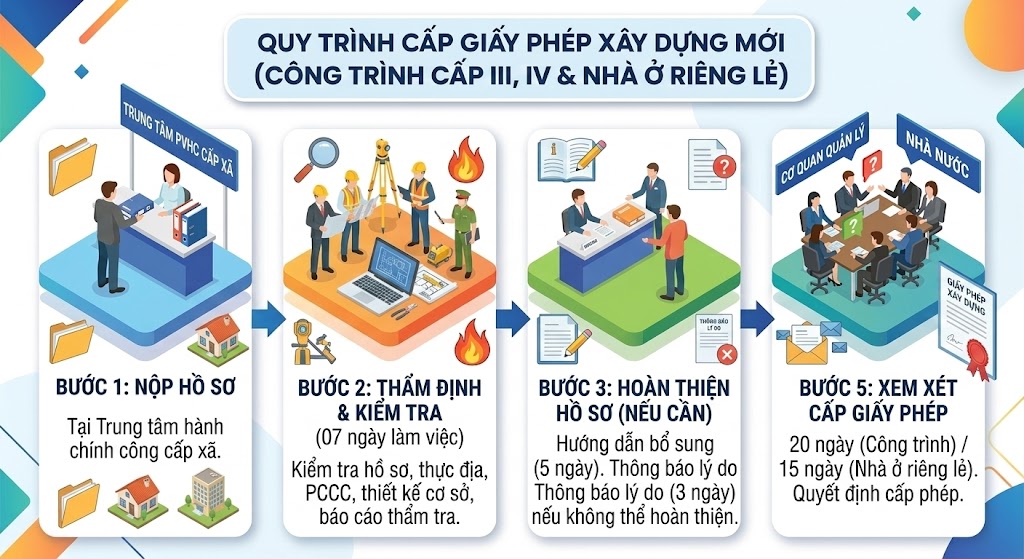 Bước 5: Trong thời hạn 20 ngày (hoặc 15 ngày đối với nhà ở riêng lẻ) kể từ ngày nhận đủ hồ sơ hợp lệ, cơ quan có thẩm quyền có trách nhiệm xem xét cấp giấy phép xây dựng công trình cấp III, cấp IV.