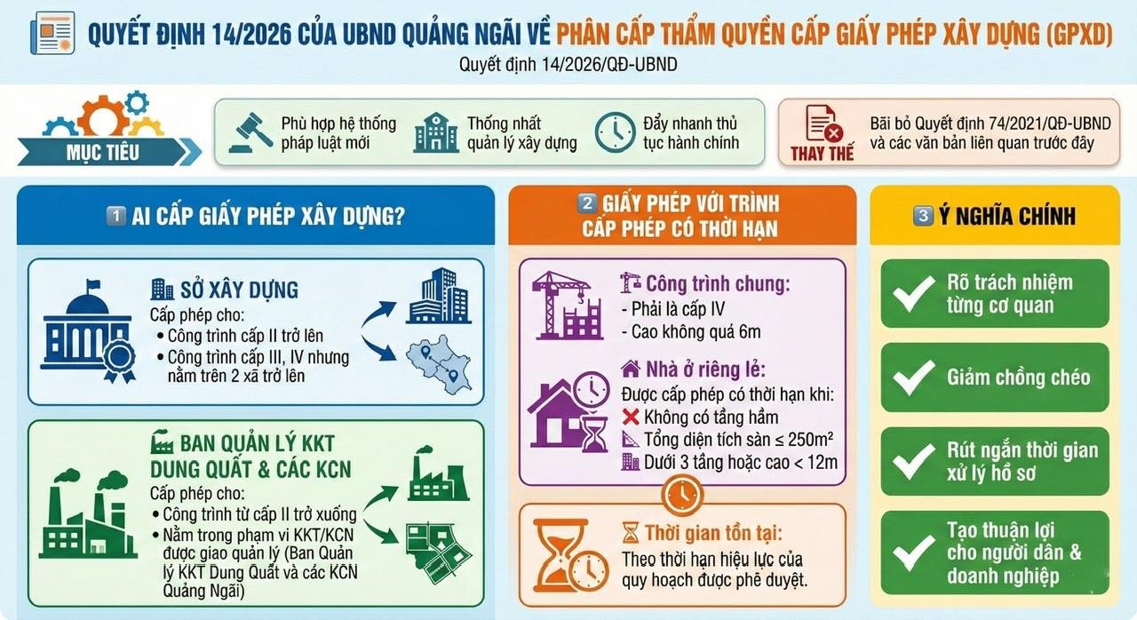 UBND tỉnh Quảng Ngãi ban hành Quyết định 14/2026/QĐ-UBND về phân cấp thẩm quyền cấp Giấy phép xây dựng (GPXD). Quyết định này quy định về phân cấp thẩm quyền cấp giấy phép xây dựng, quy mô và thời hạn tồn tại của công trình cấp giấy phép xây dựng có thời hạn trên địa bàn tỉnh Quảng Ngãi.