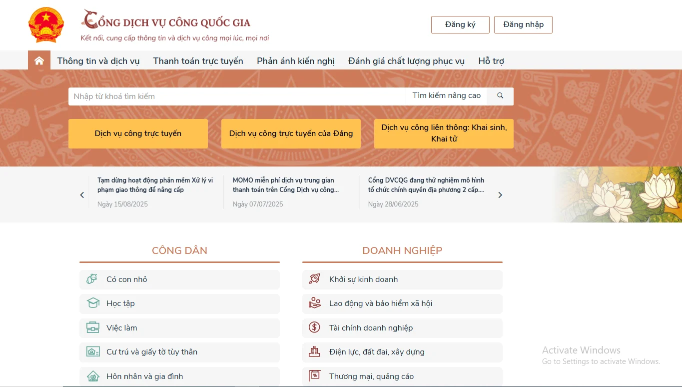 Bước 1: Công dân truy cập Cổng Dịch vụ công quốc gia tại https://dichvucong.gov.vn, chọn “Đăng nhập” và đăng nhập bằng tài khoản định danh điện tử do Bộ Công an cấp.