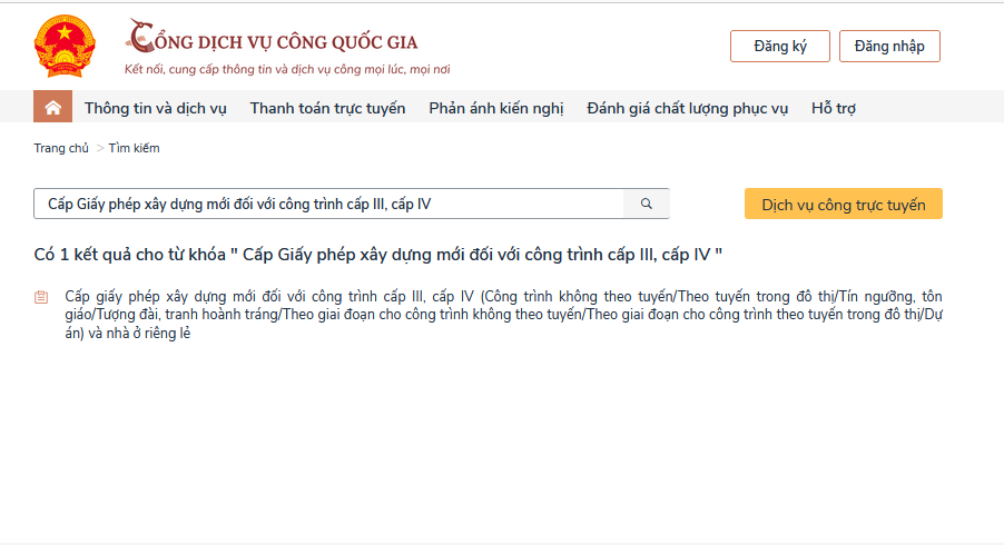 Bước 2: Tại ô tìm kiếm, nhập từ khóa “Cấp Giấy phép xây dựng mới đối với công trình cấp III, cấp IV” để tìm thủ tục hành chính.
